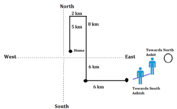 One morning after sunrise, Ankit starts from home (which is facing towards North) and goes 5 km straight out of the house and turns towards his right and goes 2 km. He turns again towards his right and goes 8 km again. Finally, he turns again towards his left and goes 6 km and reaches a park. Ankit meets his friend Ashish in the Park and they both are standing in lawn with their backs towards each other. Ankit’s shadow falls exactly towards left hand side.