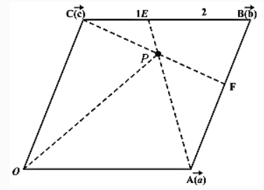 Also Position vector of \(E=\frac{\vec{b}+2 \vec{c}}{3}=\frac{\vec{a}+3 \vec{c}}{3}~~\dots\)(ii)
