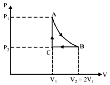 \(\mathrm{C} \rightarrow \mathrm{A}\) : Isochoric change leading to change of pressure from \(\mathrm{P}_2\) to \(\mathrm{P}_1\).
