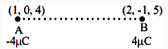 Two charges of \(-4 \mu \mathrm{C}\) and \(+4 \mu \mathrm{C}\) are placed at the points \(\mathrm{A}(1,0,4) \mathrm{m}\) and \(\mathrm{B}(2,-1,5) \mathrm{m}\) located in an electric field \(\overrightarrow{\mathrm{E}}=0.20 \hat{\mathrm{i}} \mathrm{V} / \mathrm{cm}\). The magnitude of the torque acting on the dipole is \(8 \sqrt{\alpha} \times 10^{-5} \mathrm{Nm}\), Where \(\alpha=\)___________