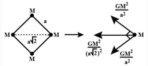 \(F_{net}=\frac{G M^{2}}{a^{2}} \sqrt{2}+\frac{G M^{2}}{2 a^{2}}\)