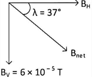 \(\begin{aligned} & \therefore \sin 37^{\circ}=\frac{B_v}{B_{\text {net }}} \\ & \Rightarrow B_v=B_{\text {net }} \sin 37^{\circ} \\ & \Rightarrow B_{\text {net }}=\frac{B_v}{\sin 37^{\circ}} \\ & =\frac{6 \times 10^{-5}}{\frac{3}{5}} \\ & =10 \times 10^{-5} \mathrm{~T} \\ & =1 \times 10^{-4} \mathrm{~T}\end{aligned}\)