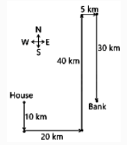 On analyzing the above figure we get the person travelled 40 km Southward and 40 km Northward, so the northward and southward distance cancelled out. The person has travelled 25 km (20 km +5 km) eastward. Therefore, the shortest distance between her bank and her house is 25 km.