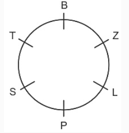 Six people B, L, Z, P, S and T  are sitting around a circular table facing center of table. B is sitting diametrically opposite to P. Z sits to the immediate left of B. T sits second to the right of Z. L sits third to the right of T.