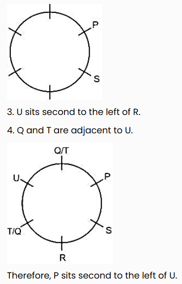 Six persons sit around the circular table facing towards the center. P sits immediate right of S. U sits second to the left of R. P and U are not adjacent to each other. Q and T are adjacent to U. Who sits second to the left of U?