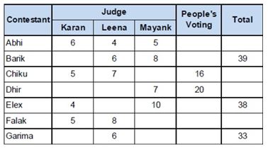 (a) Three Judges, Karan, Leena and Mayank, each of whom could award a maximum of 10 points.