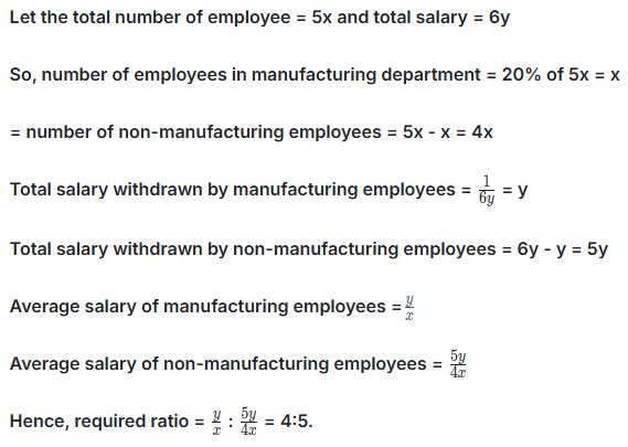 In a company, 20% of the employees work in the manufacturing department. If the total salary obtained by all the manufacturing employees is one-sixth of the total salary obtained by all the employees in the company, then the ratio of the average salary obtained by the manufacturing employees to the average salary obtained by the non-manufacturing employees is