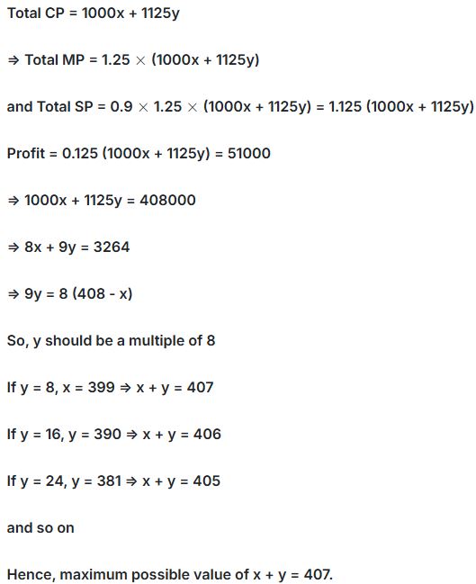 Jayant bought a certain number of white shirts at the rate of Rs.1000 per piece and a certain number of blue shirts at the rate of Rs.1125 per piece. For each shirt, he then set a fixed market price which was 25% higher than the average cost of all the shirts. He sold all the shirts at a discount of 10% and made a total profit of Rs.51000. If he bought both colors of shirts, then the maximum possible total number of shirts that he could have bought is (type in numerical)