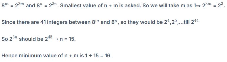 Let n and m be two positive integers such that there are exactly 41 integers greater than 8m and less than 8n, which can be 16expressed as powers of 2. Then, the smallest possible value of n + m is