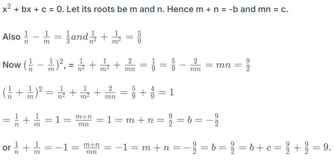 A quadratic equation x+ bx + c = 0 has two real roots. If the difference between the reciprocals of the roots is 1/3 and the sum of the reciprocals of the squares of the roots is 5/9, then the largest possible value of (b + c) is (in numerical value).