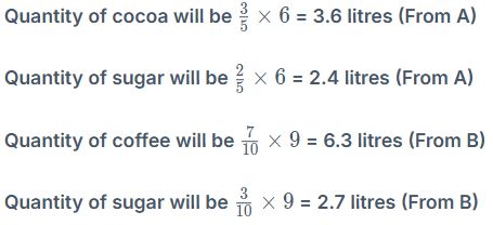 Total Mixture = 15 + 15 = 30 litres. Mixture C will have 3.6 litres cocoa, 6.3 litres coffee and 2.4 + 2.7 = 5.1 litres of sugar.