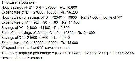 'A', 'B' and 'C' are three friends whose incomes are in ascending arithmetic progression. Incomes of 'A', 'B' and 'C' is Rs. (x2 - 1600), Rs. (50x + 19000) and Rs. (x2 + 4400), respectively. Out of the given persons whose income is a perfect cube, spends 60% of his income and saves the rest such that his savings is equal to the average of savings of other two persons. The person, whose income is (20/9) times the savings of person whose income is a perfect cube, spends Rs. '90x'.