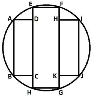 Draw the lines DH, BI and FH. It is obvious that BI and FH are the diameters of the circle. Assume that the length of DC and the diameter of the circle are b cm and d cm respectively.
