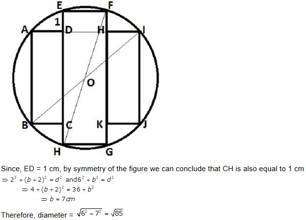 In the figure given below, a rectangle EFGH is inscribed in a circle. ADBC and HIJK are rectangles such that points A, I, J and B lie on the circumference of the circle. If AD = EF = HI = 2 cm and ED = 1 cm, then find the diameter (in cm) of the circle.