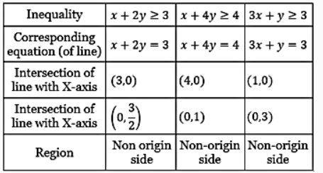 \(\begin{array}{|l|c|c|} \hline \text{Inequality} & x+3 y \geq 3 & 2 x+y \geq 2 \\ \hline \text{Corresponding equation (of line)} & x+3 y=3 & 2 x+y=2 \\ \hline \text{Intersection of line with X-axis} &  ((3,0) & (1,0) \\ \hline \text{Intersection of line with Y-axis} & (0,1) & (0,2) \\ \hline \text{Region} & \text{Non-origin side} & \text{Non-origin side} \\ \hline\end{array}\)