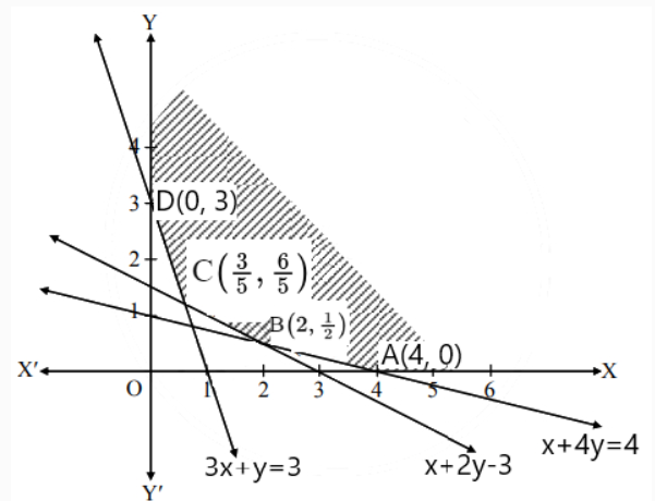 Shaded portion XABCDY is the feasible region, whose vertices are \(\mathrm{A}(4,0), \mathrm{B}, \mathrm{C}\) and \(\mathrm{D}(0,3)\).