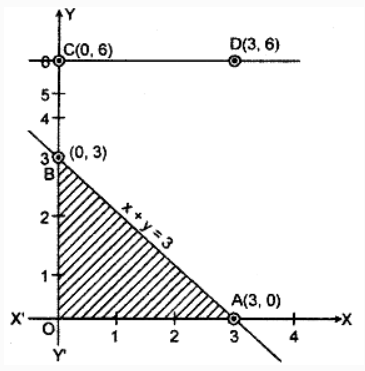 Region represented by the in equation system \(x+y \leq 3, y \leq 6\) and \(x \geq 0, y \geq 0\) is: