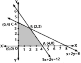 The corner points of the feasible region are \(O(0,0), A(4,0), B(2,3)\) and \(C(0,4)\), The values of \(Z\) at these points are as follows: