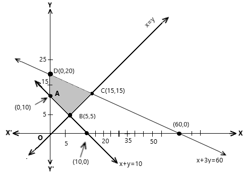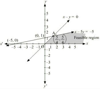 The minimum of the objective function \(\mathrm{Z}=2 x+10 y\) for linear constraints \(x-y \geq 0, x-5 y \leq-5, x \geq 0\) \(y \geq 0\), is: