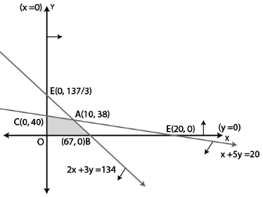 The corner points of feasible region are \(\mathrm{A}(10,38), \mathrm{B}(0,40), \mathrm{C}(0,0), \mathrm{D}(67,0)\).