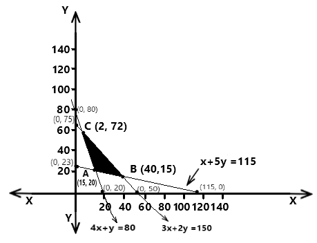 The corner points of the feasible region are A \((15,20), B(40,15)\), and C\((2,72)\). The values of Z at these corner points are as follows.