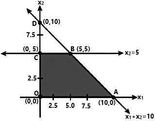 \(x_2 \) intersects \(x_1+x_2 = 10\) at B. From (1) and (4), coordinates of B are calculated as (5,5).
