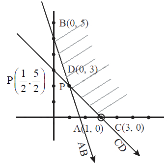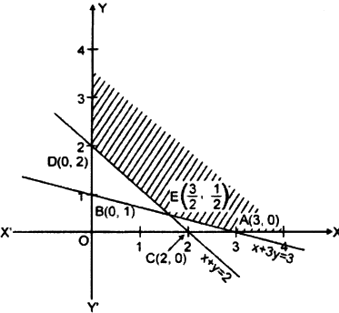 The point of intersection of lines \(x+3 y=3\) and \(x+y=2\) is \(E(\frac{3 }{ 2}, \frac{1 }{ 2})\)