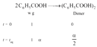 \(\begin{aligned} & \text { Moles at equilibrium }=1-\alpha+\frac{\alpha}{2}=1-\frac{\alpha}{2} \\ & \mathrm{i}=\frac{\text { Total molesat equilibrium }}{\text { Initial moles }}=\frac{1-\frac{\alpha}{2}}{1} \\ & \mathrm{i}=\frac{1-\frac{0.8}{2}}{1}=0.6 \\ & \Delta \mathrm{T}_{\mathrm{f}}=\mathrm{iK}_{\mathrm{f}} \mathrm{m} \\ & 2=0.6 \times 5 \times\left(\frac{\mathrm{w}}{\frac{122}{30}}\right) \times 1000 \\ & \mathrm{w}=2.4 \mathrm{~g}\end{aligned}\)