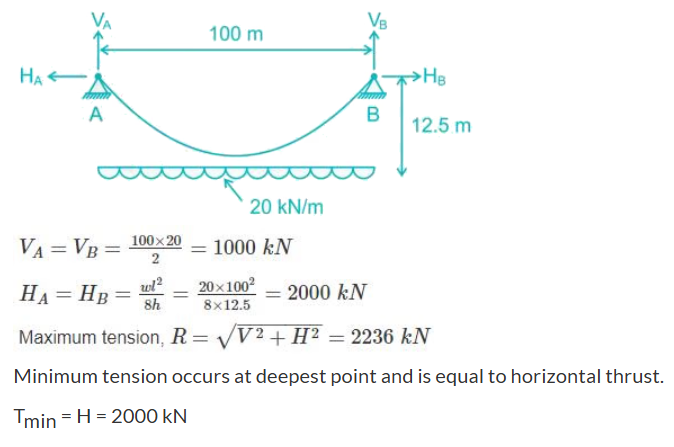 A cable carrying a load of 20 kN/m run of the horizontal span, is structured at supports 100 m apart. The supports are at the same level and the central dip is 12.5 m. Find the least tension in the cable.
