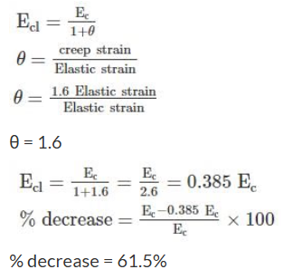 If after 28 days of the casting of RC beam, the creep strain is 60% more than that of Elastic strain Percentage decrease in modulus of elasticity according to IS 456 : 2000 is