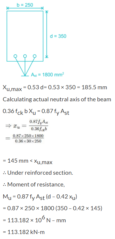\({{\rm{M}}_{\rm{r}}} = {{\rm{\sigma }}_{{\rm{st}}}} \times {{\rm{A}}_{{\rm{st}}}} \times \left( {{\rm{d}} - \frac{{{{\rm{x}}_{\rm{a}}}}}{3}} \right) = 230 \times {\rm{\pi }} \times {12^2} \times \left( {400 - \frac{{96.76}}{3}} \right) = {\rm{\;}}38.26{\rm{kNm}}\)