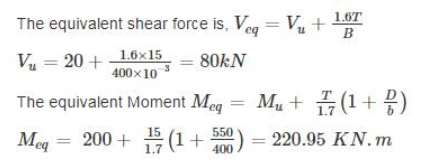 At limit state of collapse, an RC beam is subjected to flexural moment 200 kN.m, shear force 20 kN and torque 15 kN.m. The beam is 400 mm wide and 500 mm effective depth with 50 mm cover. The equivalent shear force and equivalent moment is :