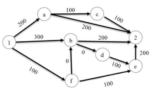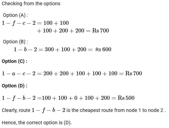 The cost of travel on an edge between two nodes is given in rupees. Nodes ‘a’, ‘b’, ‘c’, ‘d’, ‘e’, and ‘f’ are toll booths. The toll price at toll booths marked ‘a’ and ‘e’ is Rs.200, and is Rs.100 for the other toll booths. Which is the cheapest route from node 1 to node 2?