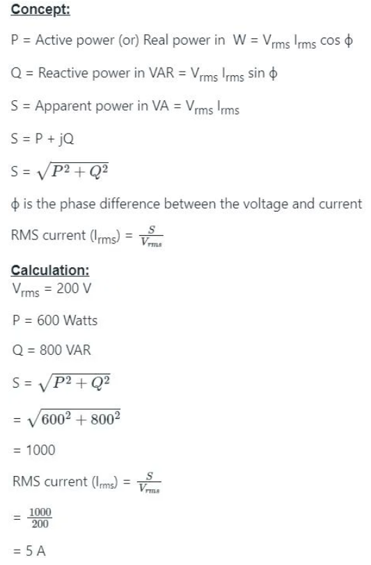 Find the current in the circuit which supplies an active power of 600 watts and reactive power of 800 VAR, if the voltage applied is 200 V (RMS value).