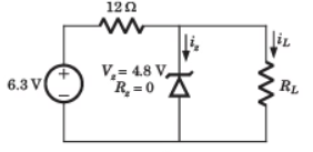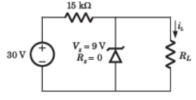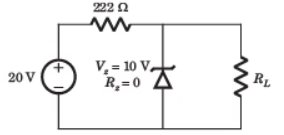 In the voltage regulator circuit in fig the power rating of Zener diode is 400 mW. The value of RL that will establish maximum power in Zener diode is: