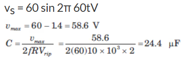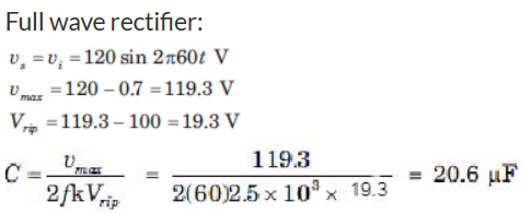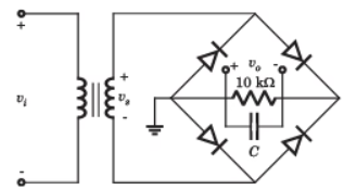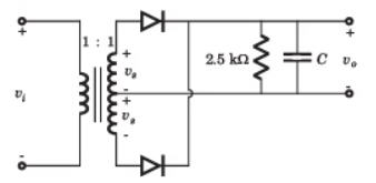 The secondary transformer voltage of the rectifier circuit shown in fig. is vs = 60 sin 2π 60tV. Each diode has a cut in voltage of Vγ = 0.6 V. The ripple voltage is to be no more than Vrip = 2 V. The value of filter capacitor will be: