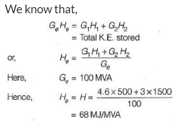 A 500-MVA synchronous machine has H1 = 4.6 MJ/MVA, and a 1500 MVA machine has H2 = 3.0 MJ/MVA. The two machines operate in parallel in a power station. The equivalent H constant for the two, relative to a 100 MVA base will be