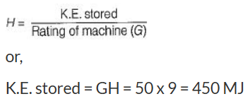 If the inertia constant H = 9.0 MJ/MVA for a 50 MVA generator, the stored energy is