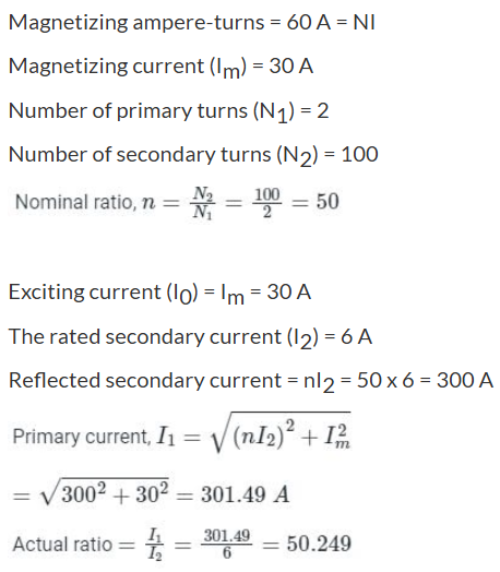 The primary of 200/1 A, 5 VA, 0.8 pf current transformer carries 100 A. The secondary current is 0.495 A. The ratio error of the CT is