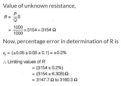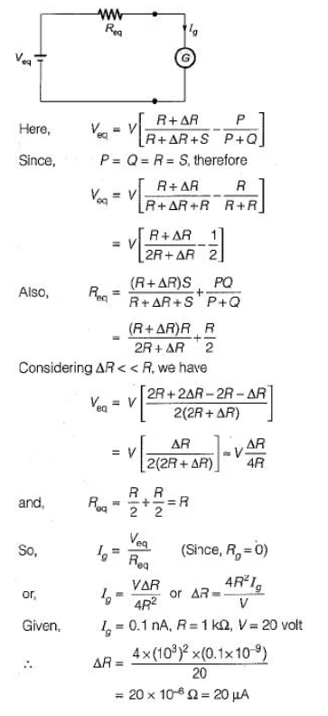 A highly sensitive galvanometer can detect a current as low as 0.1 nA. This galvanometer is used in a Wheatstone bridge as a detector as shown in figure below. The resistance of galvanometer is negligible.