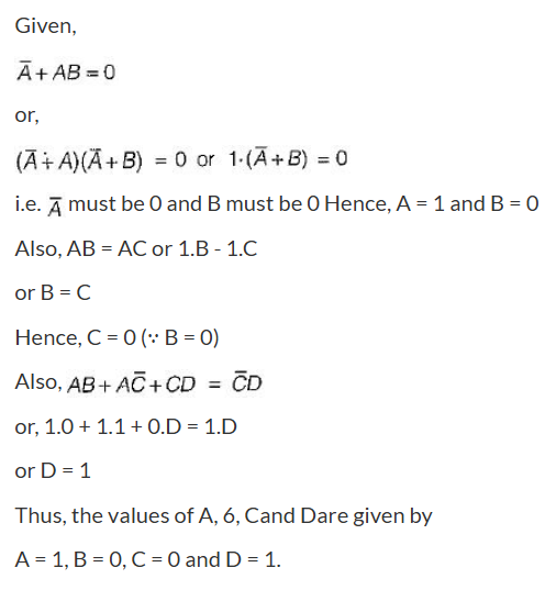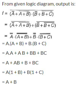 \(\begin{array}{l}= \bar A + A\bar B + A\bar C\\= \bar A + A\left( {\bar B + \bar C} \right)\end{array}\)