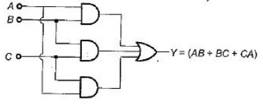 Thus, Y = AB + BC + CA which can be implemented using 3 AND gates and 1 OR gate (total 4 basic gates).