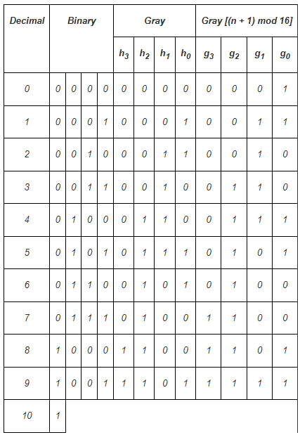 Consider numbers represented in 4-bit gray code. Let h3h2h1h0 be the gray code representation of a number n and let g3g2g1g0 be the gray code of ((n + 1) modulo 16) value of the number.
