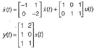 \(\dot x = \left[ {\begin{array}{*{20}{c}}0&1\\0&{ - 3}\end{array}} \right]x + \left[ {\begin{array}{*{20}{c}}1\\0\end{array}} \right]u,y = \left[ {\begin{array}{*{20}{c}}1&0\end{array}} \right]x\)