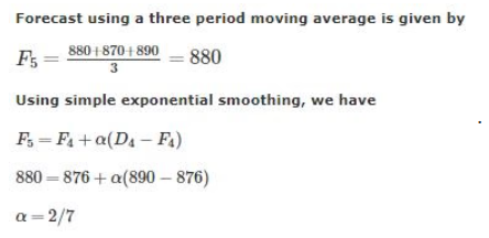 The sales of a product during the last four years were 860, 880, 870 and 890 units. The forecast for the fourth year was 876 units. If the forecast for the fifth year, using simple exponential smoothing, is equal to the forecast using a three period moving average, the value of the exponential smoothing constant a is: