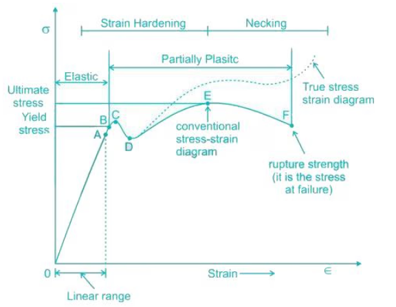 A stress-strain curve represents the relationship between the stress applied to a material and the resulting strain (deformation) experienced by the material. The curve can be divided into several regions, each corresponding to a different behavior of the material under stress.