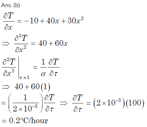 \(\frac{{\rm{\theta }}}{{{{\rm{\theta }}_{\rm{o}}}}} = \frac{{{\rm{T}} - {{\rm{T}}_\infty }}}{{{{\rm{T}}_{\rm{o}}} - {{\rm{T}}_\infty }}} = \frac{{\cos {\rm{h}}\left( {{\rm{m}}\left( {{\rm{l}} - {\rm{x}}} \right)} \right)}}{{\cos {\rm{h}}\left( {{\rm{ml}}} \right)}}\)