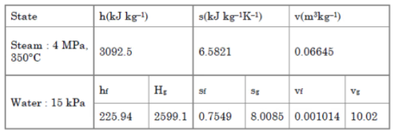 In a steam power plant operating on the Rankine cycle, steam enters the turbine at 4 MPa, 350°C and exits at a pressure of 15 kPa. Then it enters the condenser and exits as saturated water. Next, a pump feeds back the water to the boiler. The adiabatic efficiency of the turbine is 90%. The thermodynamic states of water and steam are given in the table