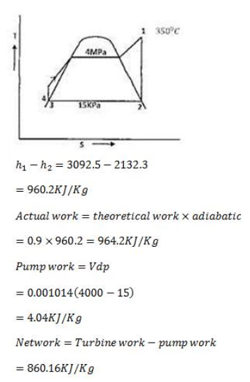 Given, WT = 600 kJ/kg, WC = 400 kJ/kg Qsupplied = 1000 kJ/kg