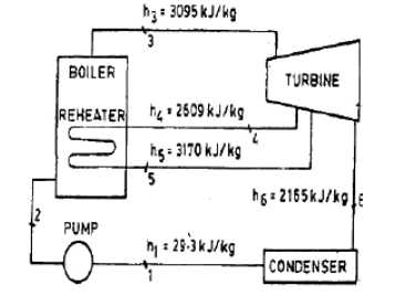 Consider a steam power plant using a reheat cycle as shown. Steam leaves the boiler and enters the turbine at 4 MPa, 350°C (h3 = 3095 kJ/kg). After expansion in the turbine to 400 kPa (h4 = 2609 kJ/kg), the steam is reheated to 350°C (h5 = 3170 kJ / kg), and then expanded in a low pressure turbine to 10 kPa (h6= 2165 kJ/kg). The specific volume of liquid handled by the pump can be assumed to be .